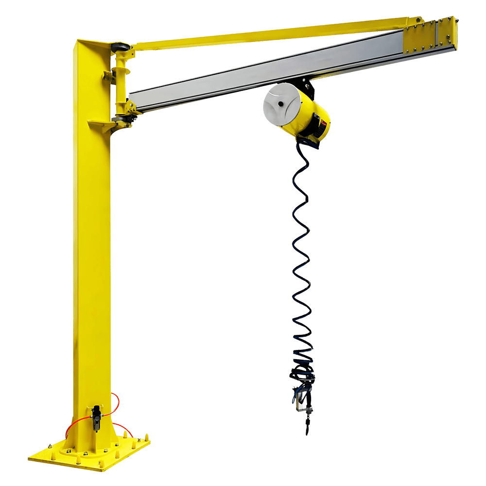 悬臂吊是属于轻型工作强度起重机,由立柱、回转机械臂、回转驱动装置及提升机组成。具有自重轻、跨度大、手动运行在悬臂上作左右直线,旋转运行,利用气动平衡吊或气动葫芦起吊工件或重物。