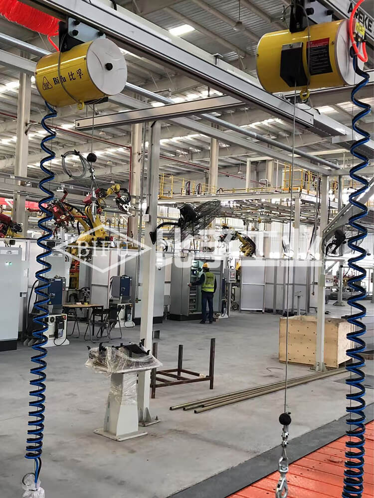 汽车主机厂双轨配2台气动平衡吊工位应用灵活、快捷、节能。