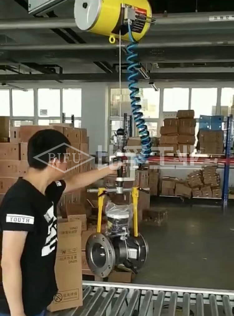 气动同轴控制款气动平衡吊配自立式悬臂吊上下料应用案例。